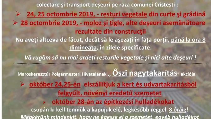 HAI LA CURĂȚENIE! 21 septembrie 2019, ora 9:00, în fața Școlii Gimnaziale Cristești!